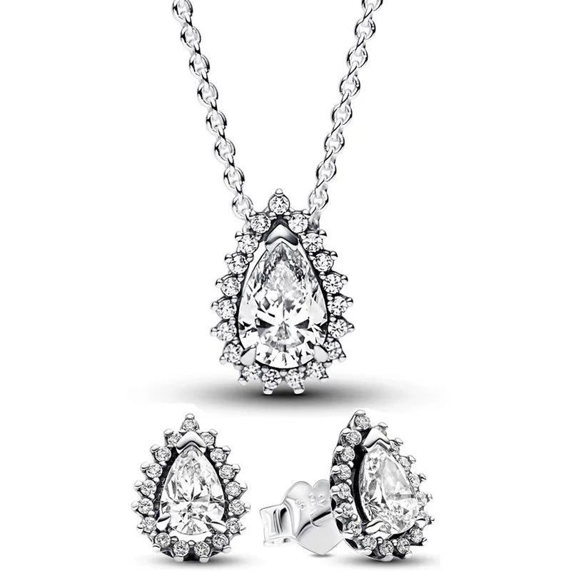 Authentic 925 Sterling Silver Sparkling Pear Halo Earring Necklace With Crystal For Women Jewelry Set Gift